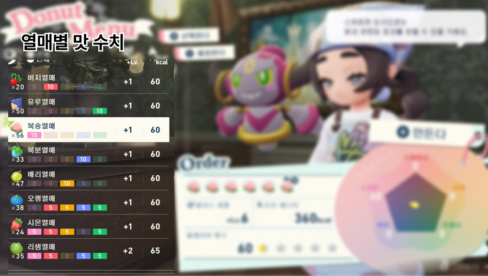 새로 추가된 컨텐츠로 도넛만들기에서 사용하는 열매와 맛에 따라 효과가 다 달라서 보기 쉽게 정리해봤습니다